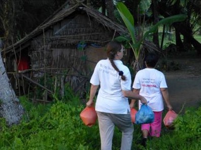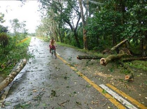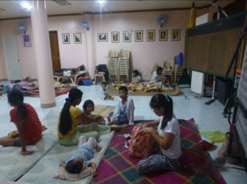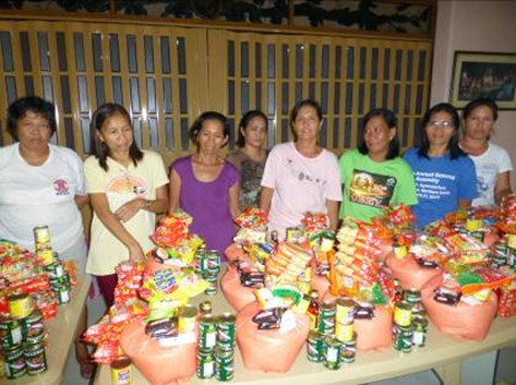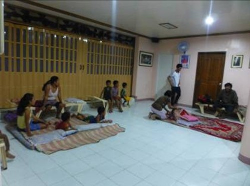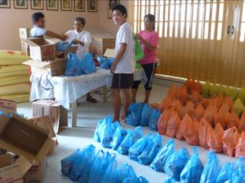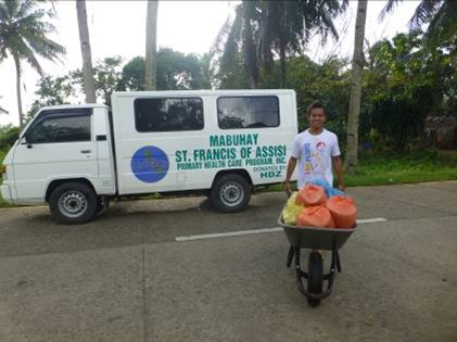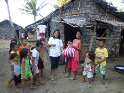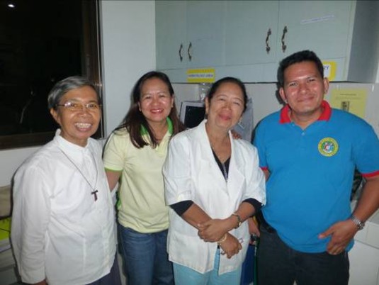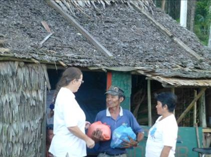 Am 8. November wurden wir, wie bereits erwähnt, von Supertaifun „Yolanda“, international als Haiyan bekannt, heimgesucht. Es war der stärkste Taifun weltweit im Jahr 2013. Wir flogen bei den hohen Windgeschwindigkeiten (über 250 km/h) fast weg, und so könnt Ihr/Sie sich sicher vorstellen, wie es den Menschen hier in den Bambus-Hütten ging. 50 Personen wurden zu uns evakuiert, da sie Sorge hatten ihnen fliegt das Dach weg und ihr Haus wird zerstört. Sr. Veronica und ich machten mehrere Runden mit dem Auto, um die Schäden zu sichten und um Leute zu uns zu bringen. Einige Wege waren durch umgestürzte Bäume fast unpassierbar, Stromleitungen lagen am Boden und Hausdachteile flogen auf die Straßen. Der Strom fiel aus. Zum Glück gab es hier keine Personenschäden. Die Leute hatten unvorstellbare Angst. Ihre größte Sorge waren ihre Tiere, die sie zurückließen, und die Sachen im Haus, da eine solche Situation leider oft von Dieben ausgenutzt wird. Gefolgt von starken Windböen kamen heftige Regenfälle auf uns zu, die die Farm und die Hütten unter Wasser setzten. Viele unserer Bananenpflanzen und Papayabäume fielen um, und die Früchte waren verloren. Die Reisfelder wurden zerstört und die Ernte vernichtet. Es war eher ein „ Monstertaifun“. Wir halfen, wo es ging. Bauten Hütten wieder auf, verteilten Reis, Konserven und andere Hilfsgüter wie z.B. Kerzen und gaben dringend benötigte Medikamente aus. Als die Situation hier bei uns im Griff war, wurden wir von unserem Bischof angefragt, auch über unseren Standort hinaus zu helfen. Wir koordinierten uns mit dem Social-Action-Büro der Diözese von Catarman. Wir unternahmen drei Fahrten mit unseren Freiwilligen in schwer betroffene Gebiete, brachten Hilfsgüter und Nahrungsmittel mit und führten medizinische Missionen durch. 700 Patienten pro Tag waren der Schnitt. Viele Patienten hatten Wunden, die sie erlitten hatten, als sie sich irgendwo festhielten, um dem starken Wind und dem Wasser standzuhalten. In einigen Gebieten, v. a. in der Nähe von Tacloban, wurde der Taifun von einer Sturmflut gefolgt. Die Bilder werden wir nie vergessen. Live dort zu sein ist noch mal anders als die Bilder im Fernsehen zu sehen. Zerstörung überall, wie nach einer Bombe, nur fehlten die Krater. Tote am Wegrand, oft nur notdürftig zugedeckt. Überall Hilferufe nach Essen und Medikamenten. Die Augen der Betroffenen leer, hoffnungslos oder gesenkt. Viele hatten wirklich alles verloren. Auch die Natur glich einer Wüstenlandschaft. Die Kokospalmen, die hier fast als Wahrzeichen der Insel gelten, wurden zerstört und damit auch der Lebensunterhalt vieler Menschen hier, da sie von der Kokosernte leben. Es wird lange dauern, bis sich die Palmen vom Sturm erholen.